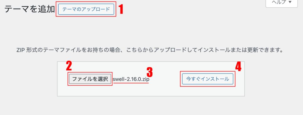 テーマのアップロード>ファイルの選択>とすすみ、zipファイルを解凍せずにそのまま選択。そして「今すぐインストール」を押下。